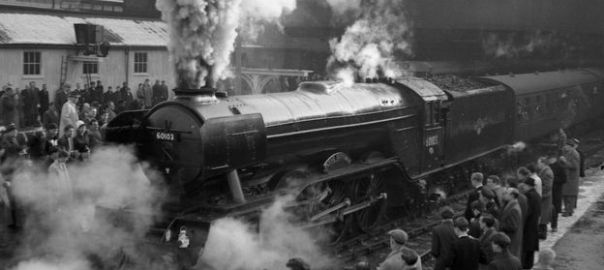 The locomotive ran with a corridor tender between April 1928 and October 1936, after which it reverted to the original type; but in July 1938, it was paired with a streamlined non-corridor tender, and ran with this type until withdrawal.[12] On 22 August 1928, there appeared an improved version of this Pacific type classified A3; older A1 locomotives were later rebuilt to conform. On 25 April 1945, A1-class locomotives not yet rebuilt were reclassified A10 to make way for newer Thompson and Peppercorn Pacifics. Flying Scotsman emerged from Doncaster works on 4 January 1947 as an A3, having received a boiler with the long “banjo” dome of the type it carries today. By this time it had been renumbered twice: under Edward Thompson’s comprehensive renumbering scheme for the LNER, it became No. 502 in January 1946; but in May the same year, under an amendment to that plan, it become No. 103.[9] Following nationalisation of the railways on 1 January 1948, almost all of the LNER locomotive numbers were increased by 60000, and No. 103 duly became 60103 in December 1948.[12]