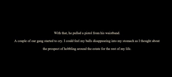 With that, he pulled a pistol from his waistband. A couple of our gang started to cry. I could feel my balls disappearing into my stomach as I thought about the prospect of hobbling around the estate for the rest of my life.