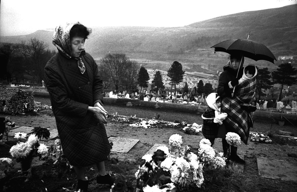 Inhabitants of the Welsh mining village of Aberfan attend the mass funeral for 81 of the 190 children and adults who perished when a landslide engulfed the junior school. (Photo by George Freston/Getty Images)