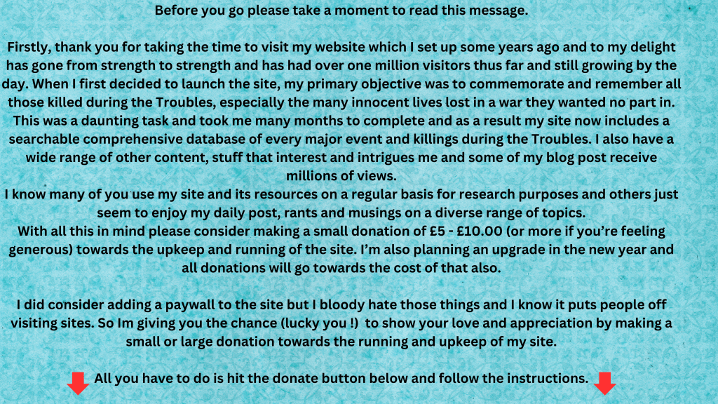 Here were our close family and friends, housed in the damp flats and maisonettes that had been hurriedly built to house those Protestants ‘put out’ of their homes in the city by avenging Catholics. They too were being burnt from their homes but back then my young Loyalist heart felt no sympathy for them; in my opinion they supported the IRA and had started the ‘war’.