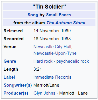 “Tin Soldier” is a song released by the English rock band Small Faces on 2 December 1967, written by Steve Marriott (credited to Marriott/Lane). The song peaked at number nine in the UK singles chart and number 38 in Canada. It has since been covered by many other notable rock artists